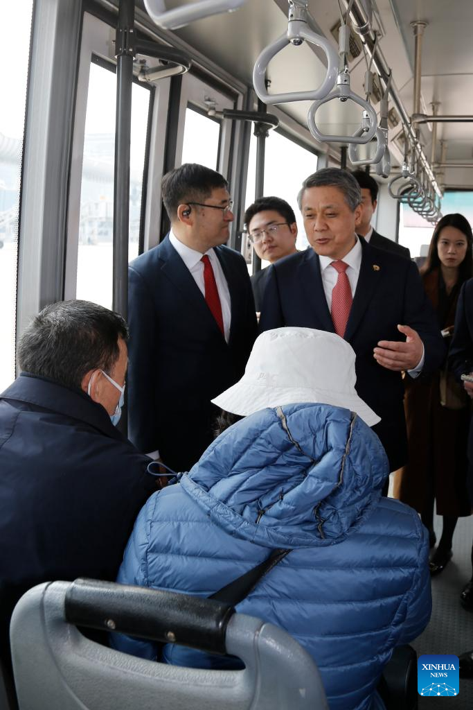 Wang Yajun (3rd L, upper), Chinese Ambassador to the Democratic People's Republic of Korea (DPRK), talks with other travelers on a shuttle bus at Sunan International Airport in Pyongyang, DPRK, March 30, 2026. An Air China passenger plane from Beijing arrived in Pyongyang Monday morning, marking the formal resumption of the Chinese carrier's passenger flight operations between the capitals of China and the DPRK. (Xinhua/Wang Chao)