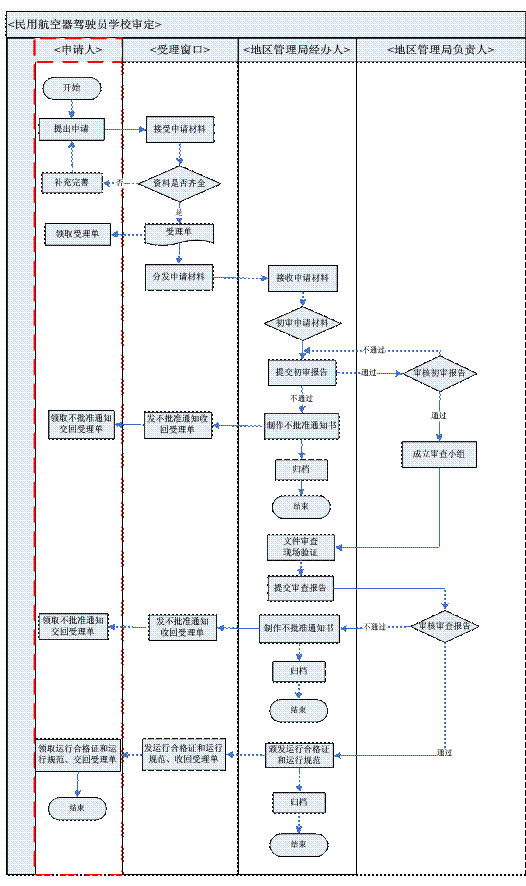 民航地区管理局在收到申请后检查申请材料,申请材料不齐全或者不符合规定格式的,应当在5个工作日内书面通知申请人需要补正的全部内容。申请人按照民航地区管理局的通知提交全部补正材料的,民航地区管理局应当受理。民航地区管理局受理或者不予受理申请,应当按照规定的格式书面通知申请人;对不受理的,还应当一并说明理由。