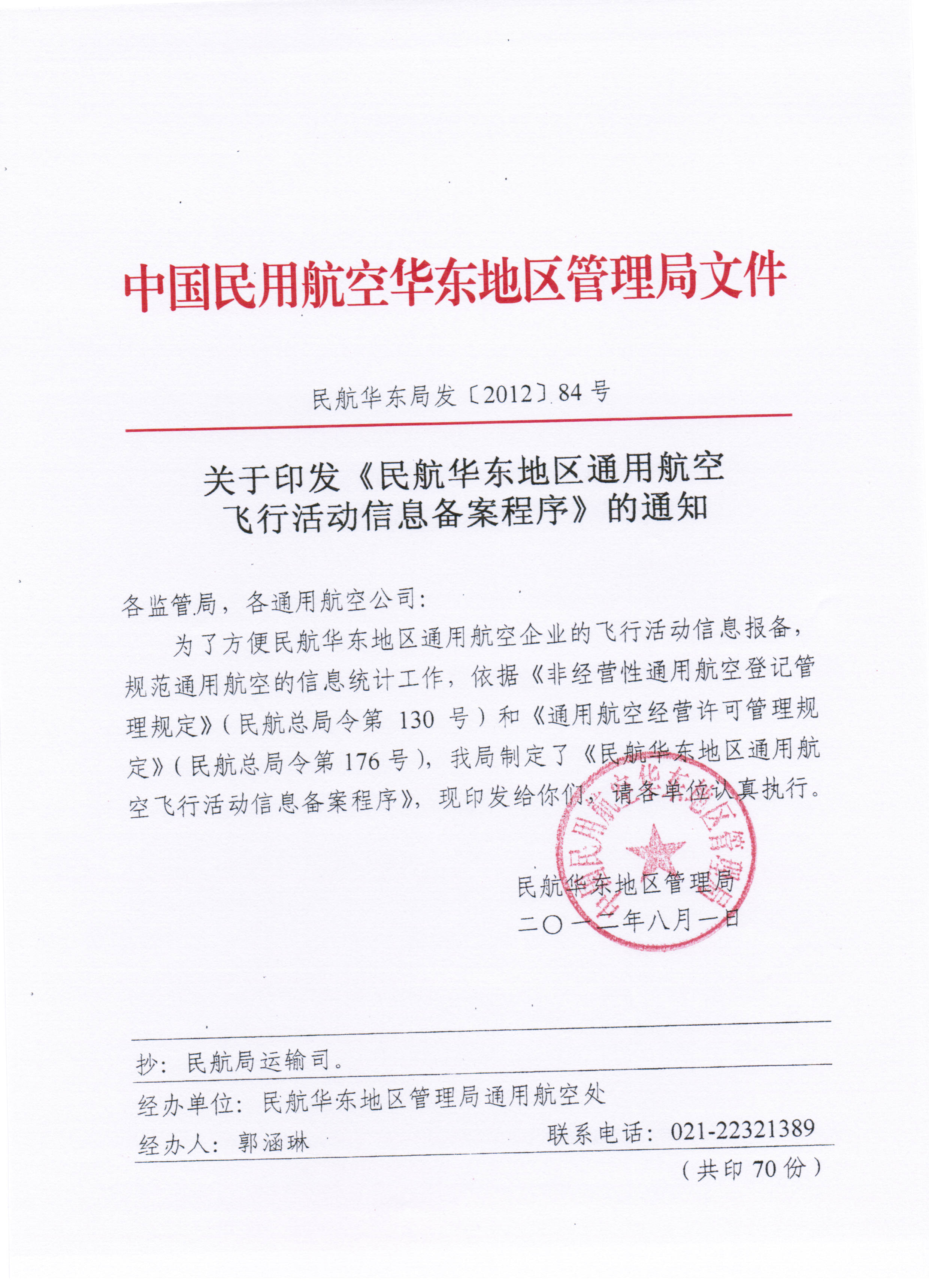 关于印发《民航华东地区通用航空飞行活动信息备案程序》的通知