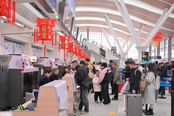 为破解旅客春运出行排队久、耗时长痛点,贵阳机场着力精简旅客排队流程,研发投用行李逾重收费系统,实现值机、托运、支付一站式办理。在3号航站楼近机位登机口全面应用人脸登机技术,显著提升旅客登机通行效率。在2号航站楼行李提取厅加装行李转盘双层渐进式缓冲防撞设备,切实减少行李磕碰、卡滞等异常情况。在中转联程厅增设自助值机区,推行粉黄标签分级管理与专人转运模式,保障中转行李“零延误”流转。在安检待检区设问询处,解答农副产品等特殊物品携带疑问、专人专岗高效办结旅客遗失物品相关事宜,并联合京东快递为旅客提供充电宝临时邮寄服务。在进港大厅,还联动顺丰快递推出“行李门到门”服务,旅客扫码即可办理贵阳市云岩区、南明区、乌当区、观山湖区指定地点行李配送服务,以“4小时直达”解放旅客双手。