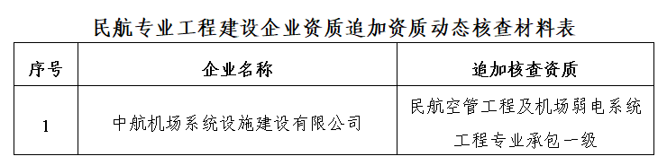 | 名 称:关于中航机场系统设施建设有限公司1家企业追加资质动态核查材料的公示 | |