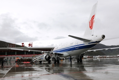 6月11日10时40分,国航西南分公司A319型客机穿越玉树地区上空浓密的乌云,冒雨降落在巴塘机场,顺利完成北京至玉树直达航线开通的首次飞行。