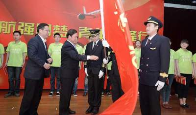 民航局党组副书记、副局长李军,团中央城市青年工作部部长徐晓给青年授旗。
