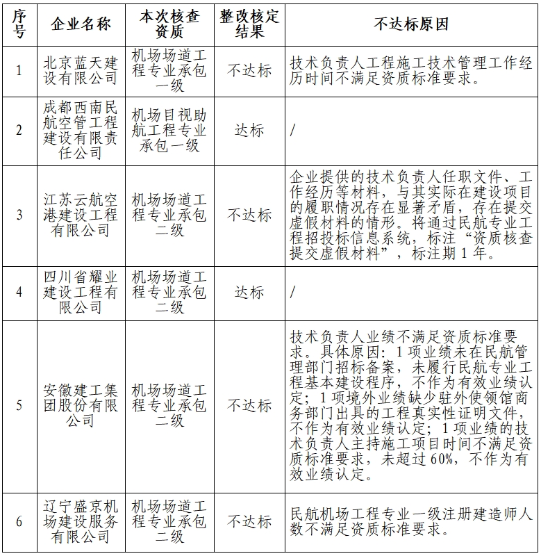 根据《关于开展2024年度民航专业工程建筑业企业资质动态核查的通知》(局发明电〔2023〕2770号)要求,机场司对部分追加企业自查材料进行了公示,组织专班对相关情况开展了核实与核定,并对核定意见进行了公示,经对相关异议及举证材料进行复核,形成本次整改核定结论。