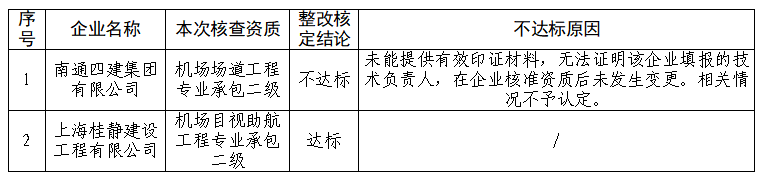 根据《关于开展2023年度民航专业工程建筑业企业资质动态核查的通知》(局发明电〔2023〕1340号)《关于开展2024年度民航专业工程建筑业企业资质动态核查的通知》(局发明电〔2023〕2770号)要求,机场司对部分企业整改材料进行了公示,组织专班对相关情况开展了核实与核定,并对核定意见进行了公示,经对相关异议及举证材料进行复核,形成本次整改核定结论。