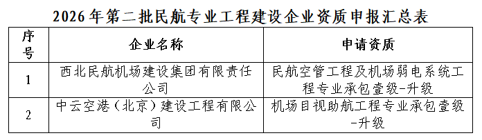 关于2026年第二批民航专业工程建设企业资质申报材料的公示