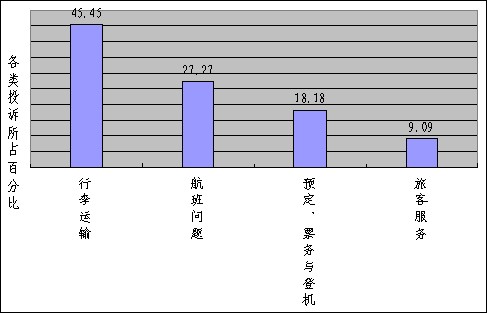本月受理消费者对国内航空公司的投诉39件,有效投诉11件。其中,行李运输5件,占45.45%;航班问题3件,占27.27%;预定、票务与登机2件,占18.18%;旅客服务1件,占9.09%。