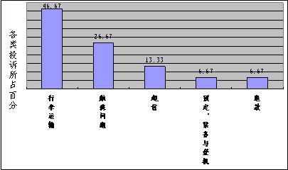本月受理消费者对国内航空公司的投诉101件,有效投诉 15件。其中,行李运输7件,占46.67%;航班问题4件,占26.67%;超售2件,占13.33%;预定、票务与登机1件,占6.67%。、退款1件,占6.67%。
