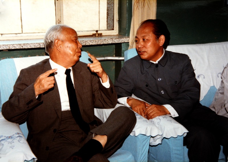 1987年6月3日,时任国务院副总理万里在北京首都国际机场飞行总队同徐柏龄亲切交谈