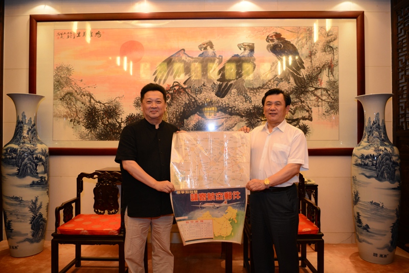 民航局局长冯正霖接收郁钧剑捐赠的1959年航线图、航班时刻及早期航空邮件海报