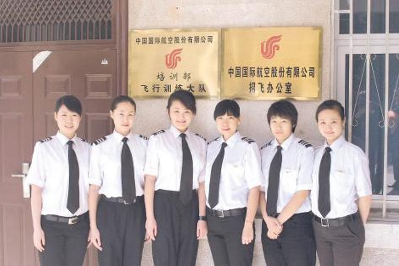 2008年,国航飞行总队首批接收六名女飞行员(蔺冠男、郭慧、刘姝妍、刘丹丹、张瑜、高倩琛),执飞波音机型,图为六名女飞行员在国航培训部飞行训练大队办公楼前合影