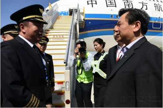 CAAC Administrator Feng Zhenglin greets the crew of the test flight at Beijing Daxing International Airport.