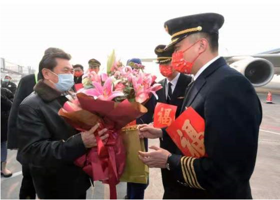 At the Daxing Airport Operation Center (AOC), Feng Zhenglin wished everyone a happy Lunar New Year with presents of small golden ox doll. He expressed gratitude to all the AOC staff working 24 hours a day to support the flights during the Spring Festival travel rush. On the ramp, Feng Zhenglin sent greetings to the crew members and maintenance personnel of Air China flight CA8615 (Daxing-Lanzhou), China Eastern Airlines flight MU5174 (Daxing-Nanchang), China Southern Airlines flight CZ8843 (Daxing-Chengdu), and China United Airlines flight KN5897 (Daxing-Guangzhou). Feng shook hands with them, sent them flowers and small presents, and took group photos.
