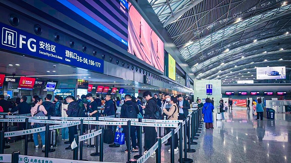 “五一”期間單日客流最高峰出現在4月29日,共運送旅客24.8萬人次,客流峰值為成都航空樞紐有史以來最高。