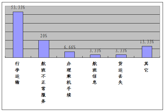 本月受理消費者對國內航空公司的有效投訴30件,行李運輸差錯16件,佔53.33%;航班不正常服務6件,佔20%;辦理乘機手續2件,佔6.66%;航班資訊1件,佔3.33%;貨運丟失1件,佔3.33%;其他4件,佔13.33%。