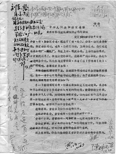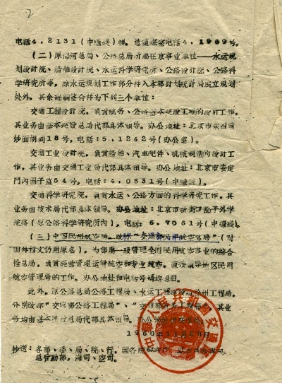 1960年11月28日,交通部印發組織機構調整情況的通知