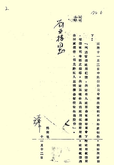1949年11月12日, 中共中央辦公廳主任楊尚昆書面通知:中央政治局決定成立軍委民航局