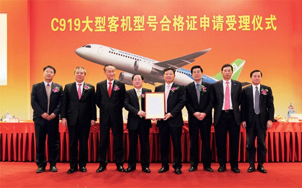 圖為2010年12月24日,民航局向C919飛機頒髮型號合格證受理申請通知書