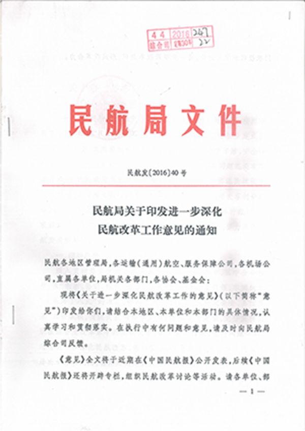 2016年5月20日,民航局印發《關於進一步深化民航改革工作的意見》