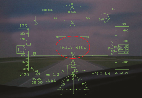在著陸拉平階段,如果拉平姿態過大,存在擦機尾危險,那麼HGS會提前顯示一個“TAILSTRIKE”資訊,提示駕駛員如果繼續增加飛機姿態,將導致擦機尾後果。