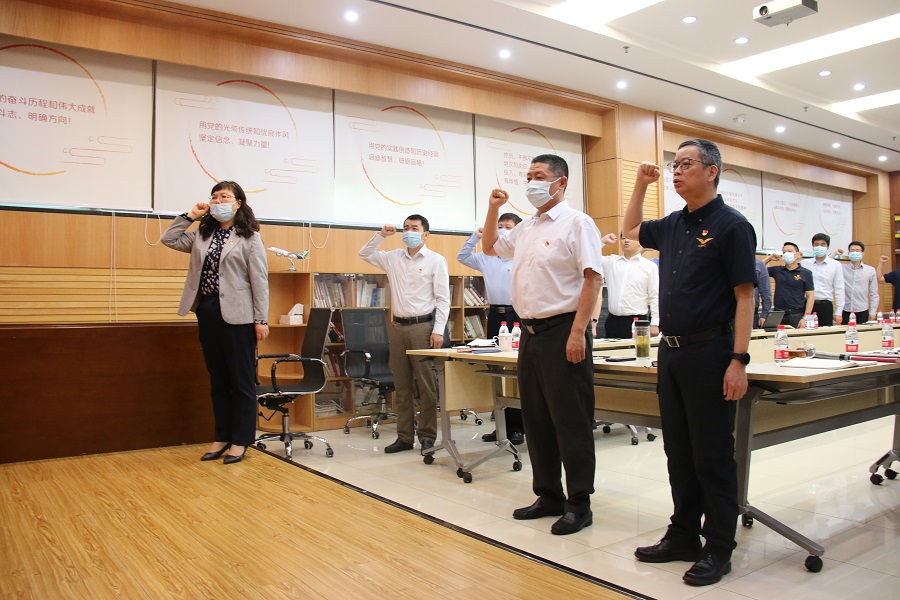 面對當前廣州疫情依舊複雜、民航運作受到較大影響的嚴峻形勢,中南局應急值守專班的全體黨員在活動中重溫了入黨誓詞,再次深刻感悟偉大建黨精神和偉大抗疫精神,進一步振奮鬥志,堅定必勝信心,讓黨旗在抗疫一線高高飄揚。